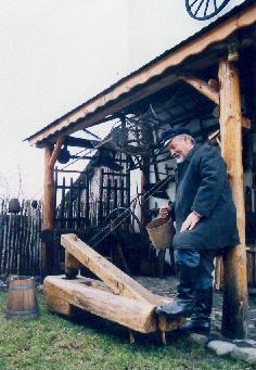 podwórze wiejskie z wystawą dawnych narzędzi rolniczych, wozem z wasagiem, kapliczką, studnią z żurawiem oraz z ekspozycją młyna wodnego i olejarnią,