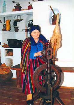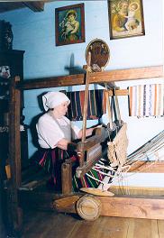 sala z wyrobami tkactwa przedborskiego, a w niej zestaw narzędzi do obróbki wełny i lnu oraz regionalne stroje ludowe,